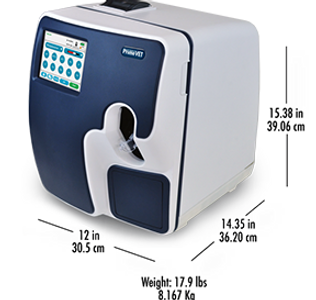 Stat Profile Prime Vet es uno de los analizadores para cuidados intensivos más pequeños y livianos. Es tan compacto que se puede colocar en cualquier lugar del hospital veterinario, o se puede usar en un carro móvil. Altura: 15.38 pulgadas (39,06 cm) Ancho: 12.00 pulgadas (30,5 cm) Profundidad: 14,35 pulgadas (36,2 cm)